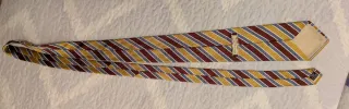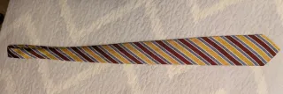 Corbata de seda natural con un diseño de rayas diagonales. - Tejido: Seda natural. - Diseño: Rayas diagonales, granate, amarillo y gris.