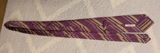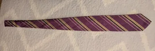 Elegante corbata de seda natural con un diseño de rayas diagonales. - Material: Seda natural. - Diseño: Rayas diagonales en tonos morados, beige y detalles oscuros.