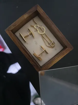 Elegante conjunto de accesorios para traje. - Gemelos con diseño clásico. - Pasador de corbata a juego con cadena.