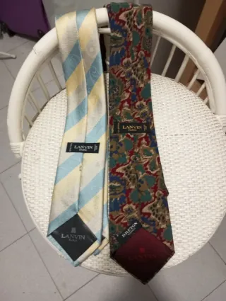 Dos corbatas de seda de la marca Lanvin, a estrenar. - Diseño a rayas en tonos azules y amarillos. - Estampado floral en tonos rojos y verdes.
