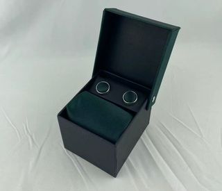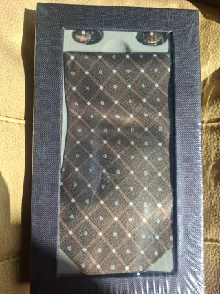 Elegante conjunto de corbata y gemelos en estuche de regalo precintado con etiqueta
