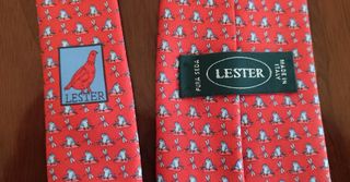 Corbata de la marca LESTER con un diseño divertido - Estampado de libelulas blancas y ranitas sobre fondo rojo. - Etiqueta azul con un pájaro rojo y el nombre de la marca.