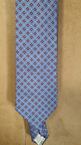 Elegante corbata de seda con un diseño geométrico en tonos azules y rojos. Perfecta para añadir un toque de estilo a cualquier atuendo. - Material: 100% seda. - Diseño: Patrón de cuadrados con detalles florales.