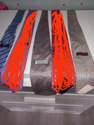 Elegante colección de corbatas de diferentes marcas. Perfectas para añadir un toque de estilo a tu atuendo. - Cinco corbatas de seda de alta calidad. - Diseños clásicos y modernos. - Colores vibrantes y estampados únicos. - Marcas reconocidas: Boss,Vittorio Pasani y Emilio La de Hugo Boss tiene una mancha