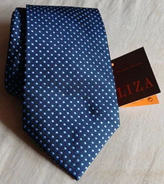 Elegante corbata de SEDA NATURAL Thomas Hill London, línea de la colección Liza. Es una corbata, de SEDA 100% NATURAL, como se indica en la etiqueta. De color azul marino con lunares azules más claros. Sin estrenar, viene en caja Albaicín Piel, tienda en la que se adquirió.