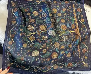 Elegante pañuelo de seda natural con un vibrante estampado. - Diseño detallado y colorido. - Tacto suave y sedoso.