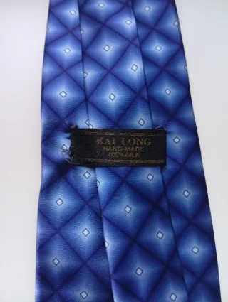 Elegante corbata de la marca Kai Long, confeccionada artesanalmente (Hand-made) en 100% seda pura. Presenta un sofisticado diseño geométrico con efecto degradado en tonos azul profundo y violeta, un estilo clásico de finales de los 90 que vuelve a ser tendencia. Es ideal para darle un toque de distinción a tus trajes de oficina o para eventos especiales como bodas y celebraciones. La seda tiene un brillo excelente y un tacto muy suave. • Estado: Muy bueno, bien conservada. • Material: Seda natural de alta calidad. • Estilo: Business / Retro-elegante.