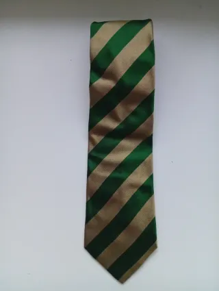 Elegante corbata vintage de la marca Van Innen, auténtica de los años 90. Confeccionada en 100% seda natural de alta calidad con una textura impecable. Diseño clásico regimental con rayas diagonales en verde esmeralda y oro, una combinación sofisticada y muy versátil. Destaca su forro interior azul con microdibujos, detalle típico de la sastrería clásica. Ideal para amantes del estilo Old Money, eventos o para dar un toque retro a un look profesional. • Estado: Excelente, muy bien cuidada. • Material: 100% Seda. Un accesorio atemporal que no pasa de moda.
