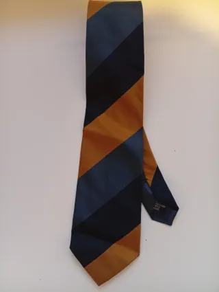 Elegante corbata vintage de la marca "The Convent Garden - Traditional Clothing" Una pieza auténtica de finales de los 80 / principios de los 90, perfecta para amantes del estilo British, Preppy u Old Money. • Material: 100% seda natural de alta calidad con textura en relieve, con gran cuerpo y caída. • Diseño: Clásico motivo de rayas regimental en colores azul marino, azul cielo y ocre dorado. • Estado: Impecable, muy bien cuidada. Sin manchas, hilos sueltos ni desgaste en el nudo. Es el accesorio ideal para dar un toque de distinción a un blazer azul marino o un traje gris en bodas, eventos o para el entorno profesional.