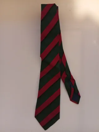 Elegante corbata vintage de la marca "The Convent Garden - Traditional Clothing" Una pieza clásica de finales de los 80, ideal para amantes del estilo British y la moda retro de calidad. • Material: 100% Seda natural con tejido en relieve (reps), con gran cuerpo y caída. • Diseño: Estilo Regimental con rayas diagonales en colores bordeaux, verde bosque y dorado. Un diseño atemporal que nunca pasa de moda. • Estado: Excelente estado vintage, sin manchas ni desperfectos. Perfecta para eventos, oficina o para completar un look Preppy/Ivy League. Se combina ideal con blazer azul marino o traje gris.