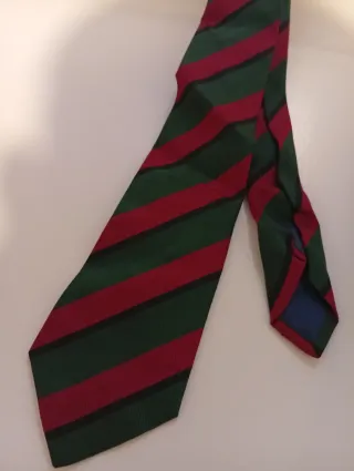 Elegante corbata de la marca Van Linnen, confeccionada en 100% seda natural de alta calidad. Presenta un diseño clásico de rayas regimentales en tonos verde bosque y rojo burdeos, un estilo "British" atemporal que nunca pasa de moda. El tejido tiene una textura de sarga (twill) muy resistente que facilita un nudo perfecto y con cuerpo. • Material: 100% Seda. • Estilo: Preppy / Business / Clásico. • Estado: En excelente estado, muy bien cuidada. Ideal para combinar con blazer azul marino o traje gris. #corbata #seda #boda #modahombre #vintage #regimental