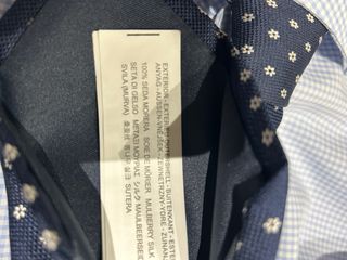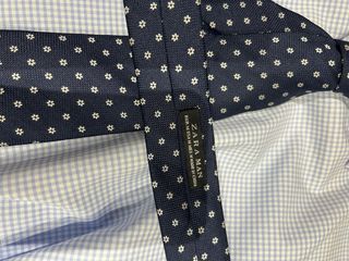 Elegante corbata de seda de la marca Zara Man. - Diseño con estampado de pequeñas flores blancas sobre fondo azul marino. - Etiqueta interior con detalles de talla (EUR M, USA M, MEX M). - Fabricada en China.