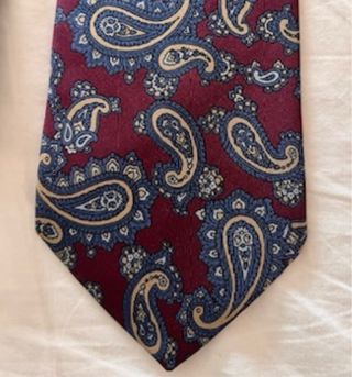 Elegante corbata de seda con un clásico estampado paisley. De color burdeos y tonos azules y ocres. - Diseño intrincado en tonos azules y beige. - Base de color burdeos profundo.