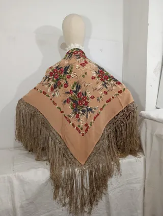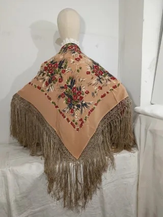 Elegante pañuelo en seda o similar, estampado con ramos de flores, con enrejado y flecos, ideal para Indumentaria tradicional. Es antiguo, años 60 aproximadamente. La parte del enrejado que está cosido al cuadrante, debido al paso del tiempo, se ha desgastado la cinta donde está aplicado, y se ha descosido, se aprecia en algún sitio que lo han reparado, pero no es roto, y habría que repasar alguno. Por lo demás, buen estado en general. Es elegante y de calidad. MEDIDAS: 90 cm, más flecos y enrejado. NO ENVÍO POR WALLAPOP SOLO POR CORREOS CERTIFICADO O ENTREGA EN MANO.