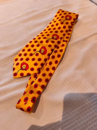 Elegante corbata de seda italiana con un divertido estampado de flores rojas y caras sonrientes sobre fondo amarillo. - Material: Seda. - Diseño: Flores rojas y caras sonrientes. - Color principal: Amarillo.