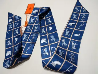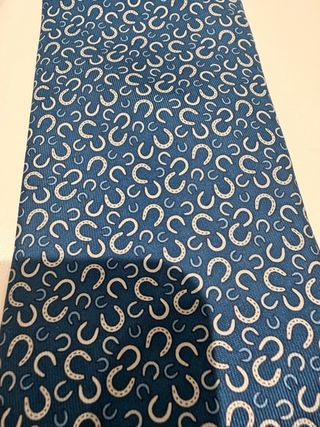 Elegante corbata de la marca Hermés con un diseño de herraduras. - Color base azul. - Dibujos en blanco y azul claro. - Patrón de herraduras repetido.