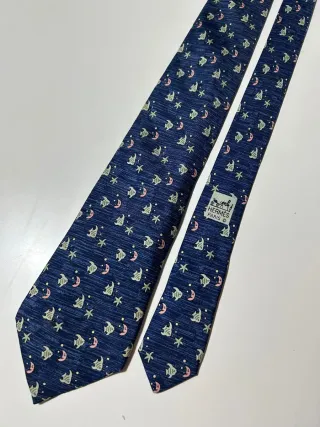 Elegante corbata de la marca Hermes con un diseño divertido de peces, estrellas de mar y lunas. - Patrón de peces y elementos marinos. - Base azul marino con detalles multicolores.