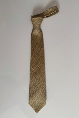 Elegante corbata de 100% seda natural Hermès con un diseño jacquard. - Material: 100% seda. - Color principal: amarillo. - Detalle del estampado: verde.