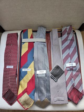 Conjunto de corbatas de marcas de lujo y materiales excelentes: seda, cashmere, lana 100%. Originales no falsas. Mejor ver en persona. Los colores varian según dispositivos. Todas elegantes. Precios variados de 50 a 100 €. Lotes de 3 10% de mas rebaja aún. Oportunidad!.