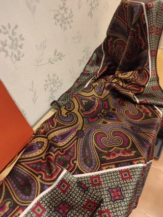 Elegante pañuelo de seda con un diseño floral y ornamental. - Tonos azules predominantes con detalles en rojo, verde y morado. - usado sólo una vez. En su caja original. - En las últimas fotos se aprecian unas manchitas de esta guardado.