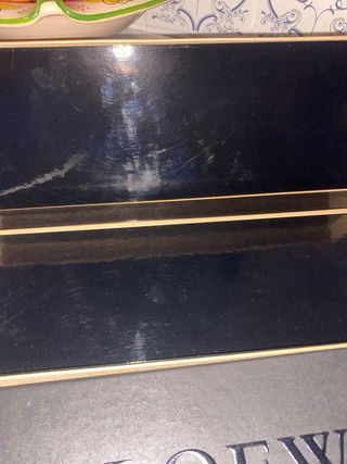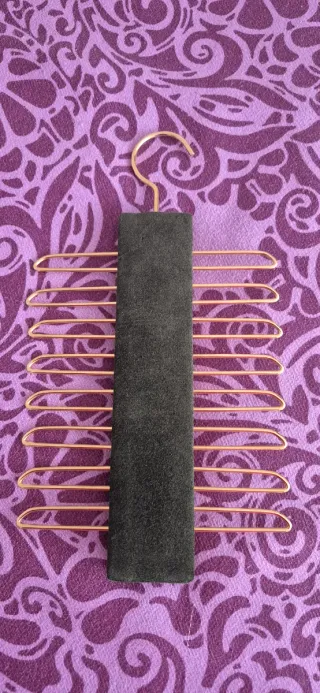 Colgador de corbatas vintage de la marca Loewe, con más de 30 años de antigüedad. - Diseño con múltiples barras para colgar corbatas. - Acabado en terciopelo verde oliva y dorado.