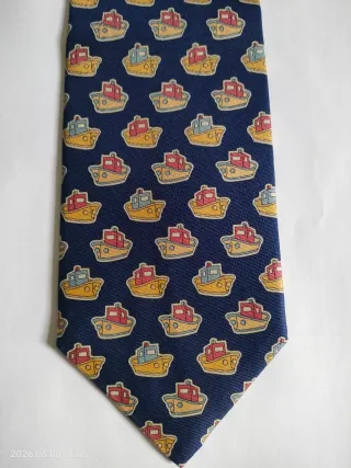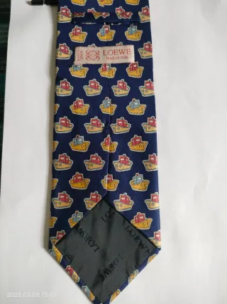 Elegante corbata de seda natural con un divertido estampado de barcos. - Diseño exclusivo de Loewe. - Base azul marino con detalles en rojo, amarillo y blanco. - Tejido 100% seda natural. - Puede tener algún defecto menor.