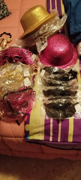 Lote de accesorios para fiestas y disfraces. - Dos corbatas de lentejuelas, una roja y otra dorada. - Gafas de fiesta temáticas. - Gorro de fiesta con diseño de búhos. Se puede vender todo junto o separado. Precio 1€ la unidad y lote 4€