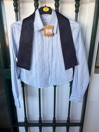 Diseño: Estampado de rayas verticales finas en tonos azules y blancos. Corte: Estilo cropped (corto) con bajo ligeramente redondeado, muy favorecedor para llevar con pantalones o faldas de tiro alto. Detalle clave: Incluye una lazada/corbata ancha en contraste de color azul marino satinado, que se puede anudar al cuello para un look "preppy" o dejar suelta. Calidad: Acabados de lujo, botones nacarados y plisado frontal tipo esmoquin.