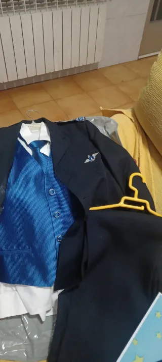 Conjunto de vestir para niño de 7 u 8 años, ideal para eventos especiales. Incluye americana, camisa, chaleco y corbata. Usado una única ocasión. También se vende por separado: chaleco 30€, chaqueta 18€, camisa 6€ y corbata 6€ - Americana gris. - Camisa azul claro. - Chaleco azul con estampado. - Corbata azul a juego.