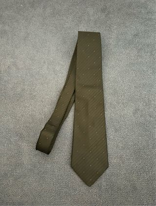 Elegante corbata con un diseño clásico. - Color base verde oscuro. - Patrón de pequeños puntos en color rojo.