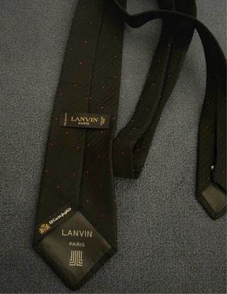Elegante corbata de la marca Lanvin. Como se puede ver en la tercera foto tiene un descosido - Diseño con rayas diagonales. - Patrón de pequeños puntos en color rojo.