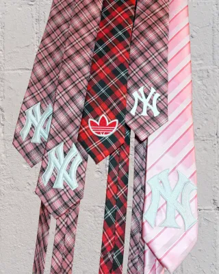 Corbata estilo rework con el logo de los New York Yankees y Adidas. Customizada a mano y cosido el oarche. PRECIO POR UNIDAD, PREGUNTA DISPONIBILIDAD. Un accesorio único con un diseño llamativo. - Patrón a cuadros en tonos rosas y rojos. - Logo de los Yankees bordado en blanco.