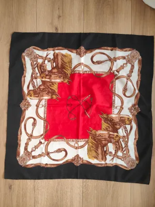 Elegante pañuelo con un diseño inspirado en el mundo ecuestre. - Estampado de caballos y elementos de equitación. - Borde negro. - Detalle central en color rojo. - Comprado en tienda local hace más de 20 años. - Estampado por las dos caras. - Medidas 75x75 cm