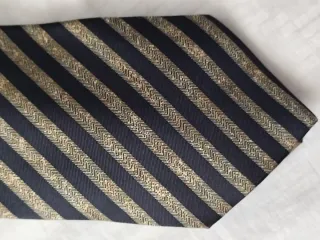 Elegante corbata vintage de seda, fabricada en Italia. - Diseño a rayas en tonos azul y dorado. - Tejido 100% seda. Nueva, nunca se ha usado