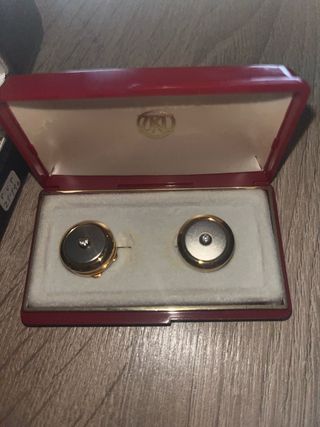 Conjunto de gemelos y alfiler de corbata chapado en oro con circonitas. Está en su caja original y sin estrenar. Por otro lado, hay otro conjunto de gemelos y alfiler en color marrón rojizo puesto un par de veces. El precio del conjunto chapado en oro es de 18 €. El conjunto de color es de 13 € con regalo del alfiler de corbata en dorado y plata.