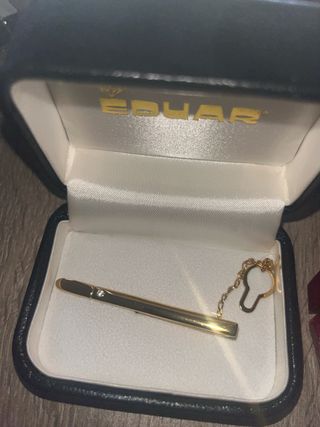 Pasador de corbata dorado, con cadena para evitar perderlo. Medida, 6 cm.