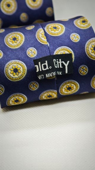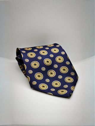 Elegante corbata con un diseño llamativo. - Estampado circular en tonos dorados. - Base de color azul marino. Hago envíos por Wallpop o recoger en Alcorcón No hago cambios Contacto solo por el chat