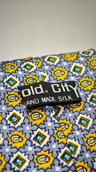 Elegante corbata de seda con un diseño de rombos pequeños en azul y puntos negros sobre fondo dorado. Perfecta para añadir un toque de distinción a cualquier atuendo. - Material: 100% Seda. - Diseño: Rombos pequeños en azul y negro. - Color principal: Dorado.