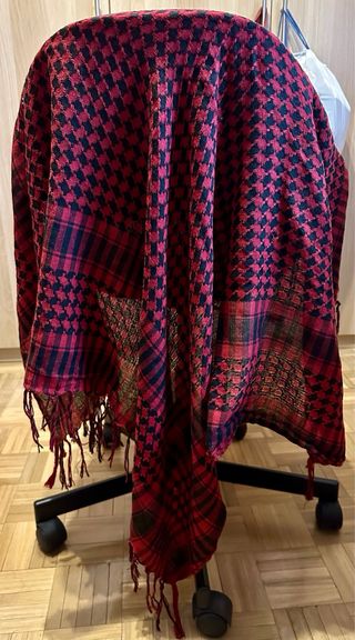 Pañuelo palestino con diseño a cuadros en rojo y negro. Un accesorio distintivo. - Diseño a cuadros. - Flecos en los bordes.