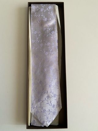 Corbata de marca, muy elegante, ideal para cualquier celebración o festejo. En perfecto estado, solo un uso. Color crema con bordado fino en hojas. Tiene un leve brillo satinado.