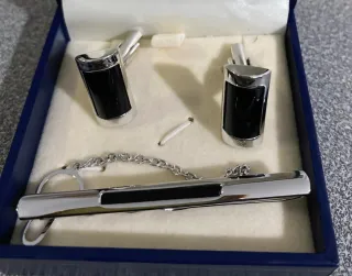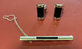 Elegante conjunto de gemelos y pasador de corbata. - Gemelos con detalles en negro y plateado. - Pasador de corbata a juego.