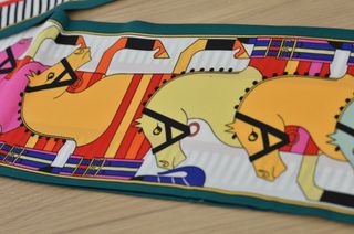Pañuelo sedoso con estampado multicolor de caballos. Es alargado. Medidas: 144x14cm. Composición: 100% poliéster (acabado sedoso)