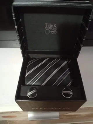 Corbata y Gemelos Set Negro y Plateado