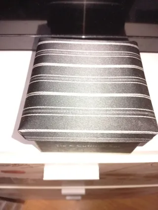 Elegante conjunto de corbata y gemelos. - Corbata con diseño de rayas finas. - Gemelos redondos con detalles a juego.