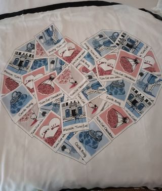 Pañuelo con un bonito estampado de corazón, lleno de detalles.90x85cmt. - Diseño con ilustraciones de moda. - Tonos rosas y azules. - Tejido ligero y suave.