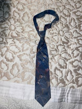 Elegante corbata de seda natural con un bonito estampado. - Material: Seda natural. - Color: Azul. - Diseño: Estampado floral pequeño en tonos dorados y marrones.
