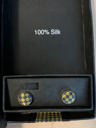 Conjunto elegante de corbata 100% seda con pañuelo a juego y gemelos. Totalmente nuevo, sin uso, en su caja original. Ideal para bodas, eventos, graduaciones o regalo. Colores azul marino y amarillo con estampado geométrico moderno.