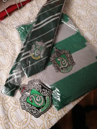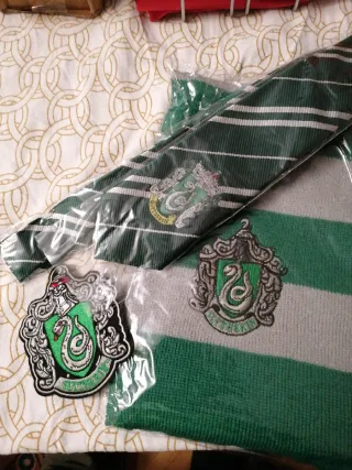 Conjunto de bufanda, corbata y parche termoadhesivo, con sus escudos bordados de Slytherin. Bufanda a rayas verdes y gres, Corbata a rayas oscuras y blancas con escudo. Mas cosas en mi perfil.