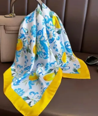 Precioso pañuelo de seda con un vibrante estampado. - Medidas: 70x70 cm. - Diseño de limones y flores azules sobre fondo blanco. - Detalle de borde liso en color amarillo.