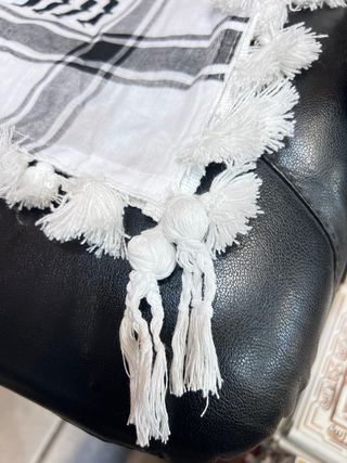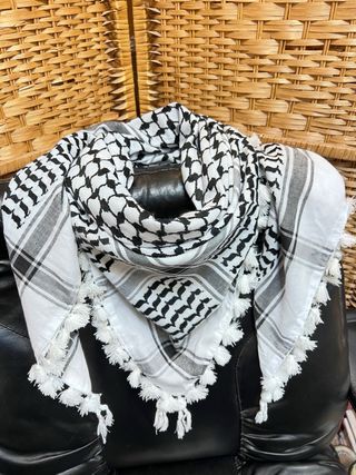 Pañuelo de calidad contiene alta porcentaje de algodón (blanco/negro). La kufiya Palestina es un símbolo de la identidad nacional y cultural del pueblo palestino, Y encarna la resistencia, La solidaridad y la lucha contra la ocupación. Los patrones que la adornan reflejan el vínculo del palestino con su tierra y su vida: líneas gruesas representan las redes de pesca en el mar, Y las hojas del olivo y a la sacralidad de este árbol en la herencia palestina. Medidas:(125*125cm) más unidades disponible. Peso:230gm Entrega disponible. *Para cualquier pregunta, no dude en escribirme.